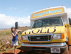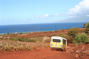 ■収穫したての甘〜いパイナップルが食べ放題! 美しい自然に囲まれたマウイ島西海岸にあるセレブ御用達のリゾート地、「カパルア・リゾート」。ここカパルアで人気の「パイナップル・ツアー」に編集部が参加してきました。リゾート内にある「カパルア・アドベンチャー・センター」の前で待ち合わせです。ここは、「カパルア・アドベンチャー」のロゴが入ったスポーツウェアやアウトドアグッズのショップと各種アクティビティの申し込みデスク、そしてカフェを兼ねています。ショップにはオーガニックコットンのウエアやリサイクル布を使ったエコなスポーツウェアなどほかでは手に入らないアイテムが目白押しです。 本日のツアーガイド、カルロスさんが現れました。一体、どんなツアーなのか、ドキドキです。早速、パイナップルのロゴがついたバスに乗り込みます。まず、バスは「ザ・リッツ・カールトン・カパルア」に隣接するハワイアンのへイアウ(神殿)跡へ。ここでは、1985年にハワイアンの遺跡が見つかったことから保護区となっているのだそう。遠い歴史に想いを馳せつつ、バスはリゾートに隣接する巨大なパイナップル畑へと向かいます。「古代のハワイ人たちは、このカパルアの地に紀元後650年頃にやってきたと言われています」とガイドのカルロスさん。昔のハワイアンたちは、水が豊富なこの地に居を構え、水源を中心に土地を分割して住んでいたのだそうです。