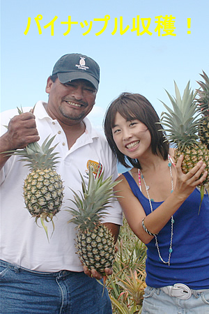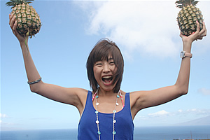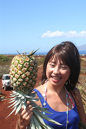 「食べごろのパイナップルはね、こうやって見分けるんだよ」と一番ベストな状態のパイナップルの見分け方をパイナップル畑でカルロスさんが指南してくれます。その場でパイナップルの皮をストンと落としてくれて、下のほうからスライス。お、美味しい〜。天にも昇る甘さです。それから、次々といろいろなパイナップルをその場でカットしてもらい試食します。ちょっと青いパイナップルはフレッシュだけれど酸味が強く、熟れ過ぎのパイナップルはえぐい甘さ。サボテンの花のようなパイナップルの花も咲いています。可愛い〜。パイナップルをひとしきり食べた後で、今度は有機栽培の畑でオーガニックのパイナップルを試食させてもらうことに。ちょっぴりこぢんまりした畑でさっそく食べごろのパイナップルを発見。カットしてもらい、パクッ。おぉぉぉ… こ、これはいままでに食べたことのないような爽やかなふんわりとした甘さです。まるで、幸せが全身に染み渡っていくような感じ。「こんな美味しい採れたてのパイナップルがいつも食べられるなら、マウイに住みたいな〜」なんて妄想しながらオーガニックのパイナップル畑を後にします。帰りがけにカルロスさんがおもむろに大きな箱を取り出して、畑で勢い良く収穫してパイナップルを2つずつ詰めてくれます。これは、なんとツアーの参加者がもらえるお土産なのです。な、なんてお得なツアーなんだろう。最後にパイナップルのレシピブックももらって、大満足。ハワイアンの古代遺跡の見学から始まって、パイナップルをお腹いっぱい食べて西マウイの大自然からいっぱいエネルギーをもらえたこのツアー。こんな経験って他ではなかなか出来ないですよね。このツアーなら、ハードなアウトドア系のアクティビティが苦手なお年寄りや子どもでも十分楽しめるので「今度は家族を連れて来よう」と胸に誓ったのでした。 |