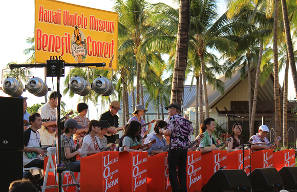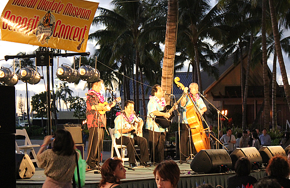 ハワイ最大のウクレレの祭典であるウクレレピクニック・ウィークエンドの一環として、2月9日(土)午後6時より、第1回ウクレレ・ミュージアム・ベネフィット・コンサートが、ヒルトン・ハワイアンビレッジのグレート・ローン・エリアで開催されました。このコンサートの収益金はカカアコ・ウォーターフロント・パークに建設予定のウクレレ・ミュージアムのために使われます。地元ハワイと日本のミュージシャンによる美しい調べが夜空に漂い、皆の心が一つになった、素敵なコンサートの模様をご紹介しましょう。