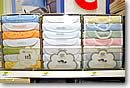 ベビーコーナーにあるマーサのコレクションはベッド周りのものが中心です。カラーはピンク、ホワイト、ブルー、グリーン、イエローの淡いパステルカラーで、動物やフラワープリントのキュートなデザインばかり。ベビーベッド用のシーツ、ブランケット、防水パッド、クリブバンパー(ベッド柵の内側に取り付けるパッド)など、一通り揃っているので一気にカラーコーディネートできるわけです。品質もベビーの肌に優しい綿100%が中心。さすがKマート限定というだけあって値段も$20以下のものがほとんど。ベビーのリネン類なら重くないので日本に持って帰るにもおすすめです。