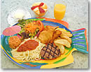 キッズ・メニューは子供が好きなスパゲッティ、ホットドッグ、ハンバーガーなど約6種類。ランチとディナーはほぼ同じ内容ですが、値段はランチの方がお手頃です。キッズ・メニューはカニの形をしたキュートなお皿に盛られ、フレンチフライやフルーツパンチ、シャーベットも付いているほか、メニューは魚のお面として持ち帰ることもできます。大人用のメニューも種類豊富で、週末のブランチは地元の人にも大人気。なお、キッズ・メニューは10才以下が対象です。 ●大盛りお子さまランチにびっくり…「パラディーソ・シーフード&グリル」