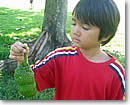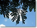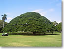話題の巨木は、ガーデン入口のすぐ右手に、ドッシリとそびえています。「この木なんの木」は、実はモンキー・ポッドという種類。中南米原産のマメ科の植物で、熱帯地区に広く生息し、通称アメリカ・ネムとも呼ばれています。いったい、どんな花が咲き、実がなるのでしょうか? 気になる花はネム特有の羽毛のような淡いピンク。マメ科の植物ですから、20〜30センチもの大きく平たいインゲンのような実がなります。樹齢は推定約120年。高さ25メートル、そして木を真上から見た時の全体の直径は、ナント40メートルもあるそうです。 |