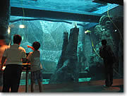 ■プウオオ、キラウエア火山 センター最大の人気展示物とも言える、火山の模型。キラウエア火山で現在活発に噴火を続けるプウオオ火口にちなんで名づけられた、3階建てに匹敵する高さのこの火山は、アルミニウム製。山頂の真横を通るレインボー・ブリッジから、煮えたぎるオレンジの溶岩(実は乳白色の蛍光塗料入りの水をオレンジ・ライトで照らしたもの)を間近に眺めることが可能です。ブリッジに備え付けのボタンから操作をして、ガスを噴出させたり、噴火を起こさせることもできますよ。模型とわかっていながらも迫力満点で、一見の価値あり。火山内部も探検でき、チューブ状の溶岩トンネルの中にスライドがあったり、ユニークな形態の溶岩の標本を見たりすることもできます。 |