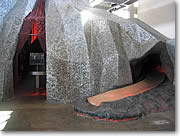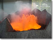 ■3階建ての高さの火山がたびたび噴火 センターを入るとすぐに、目の前には岩を模した壁と(ラバロック・スラブス)、小さな丸い鏡を数千も組み合わせて壁一面を覆ったオブジェ(マカニ・ウォール)が目に入ります。ラバロック・スラブスは、ハワイで見られる5タイプの溶岩の模型とも言えるもの。マカニ・ウォールはわずかな風にも反応し、風の流れを視覚的に示してくれる美しいオブジェで、世界的な美術家、ネッド・カーンの作品です。双方とも、見過ごしてしまいそうな静かなアート作品ですが、どうぞこれもしっかりチェックしてくださいね。 |