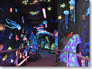 ■オリジンズ・トンネル 同センターの目玉の一つ、48メートルにも及ぶトンネルです。入口付近は珊瑚礁をイメージし、次いで熱帯雨林、最後に火山地帯と、ハワイの自然を海から山にかけて辿るというのがその趣向。中は暗いですが、壁にはハワイの子供たちが作った動植物が蛍光カラーで輝き、幻想的な美しさです。珊瑚礁の部分では海の生物、熱帯雨林では動植物やイノシシの姿をした半神カマプアア、火山の部分では火山の女神ペレも登場。鳥のさえずりなどともに、ハワイの創世記、クムリポのチャント(詠唱)などが流れ、ムードも満点です。 |