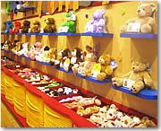 広々として原色に溢れた楽しいショップに入ると、まず目につくのが壁ぎわに並んだ、綿の入らない「抜け殻状態」のぬいぐるみたち。ぬいぐるみ作りは、ココからスタートします。様々なタイプのクマを中心に、ネコちゃんやモンキー、ポニー、犬、はては可愛いカエルまでが揃い、クマだけで13種、全体ではなんと30種以上! しかも価格は$10〜$25。中心価格帯は$15〜$18と大変リーズナブルです。「作る」楽しさがプラスされるわりに、一般店でただぬいぐるみを買うのと変わらないプライス設定なのも、同ショップの人気の秘密でしょう。 |