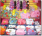 ■着せ替え用ウエアも別売り ショップの半分はブティック。別売りでぬいぐるみ用ウエアや靴、小物が膨大な品揃えで並びます。靴は、なんと人気ブランド、スケッチャーズ製の靴が40種類以上も! スパンコールつきのサンダルから革靴、ブーツまで、ぬいぐるみにはもったいないほどの素晴らしいセレクション。下手なベビーショップの靴コーナーよりよほど立派かも? ウエアも、ドレスからミリタリティ・ルックまで何でもあり、キティちゃん柄の下着や、なんとウィッグまであってビックリ。人気は、全米でもここハワイ店限定のアロハウエア・コーナー。フラスカートやアロハシャツ、ムームー、ハワイ大学のロゴ入りTシャツなど、ハワイアンなグッズが壁いっぱいに並び、見逃せません。 |