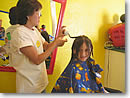 ◎待ち時間にTVゲームやDVDも! 待合いコーナーにも、DVDプレーヤーや任天堂のテレビゲーム、絵本やオモチャ、塗り絵などがズラリ。待ち時間を忘れてしまいそうになるほど、楽しさも特筆ものです。女の子2人を連れてきていたローカルのお母さんは、「このサロンは子供2人連れで来ても楽々。子供達が『また、ヘアカットに行きたい』と言うので、2ヵ月に1度は来ています」と、話していました。そのお母さんの2歳になるチビッコは、自分の順番が来るまでひたすら塗り絵をしながら、おとなしく過ごしていたことでもお分かり頂けると思います。 |