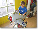 シャンプーが終わると、子供はポニー、オートバイ(ハーレー・ダビッドソン)、オープンカー、飛行機型のイスから好きなものをチョイスして座り、ヘアカット。それぞれのイスの前に1台ずつ、ミッキーマウス型のテレビも設置されているので、子供は好きな番組を楽しみながら、髪を切ってもらえるというワケです。この時、もしお腹が空いていたなら、スナックのリクエストもOK。アニマルクラッカーやロリーポップなどが用意されています。こうしてテレビやオヤツを楽しみながら、ヘアカットはアッという間に終了です。