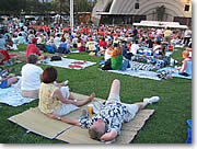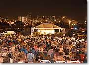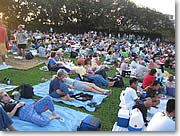 基本的に芝生の広場が会場として使われるので、椅子席ではなく、みんなビーチマットやブランケット、シーツなどを持ち込み、まさに「ピクニック」しながら満喫できるのが、野外コンサートの醍醐味。そして、開演まで飲んだり食べたり、昼寝したり。思い思いに自由に過ごすのがハワイ流なのです。夏の特別コンサートだけでなく、常設のワイキキ・シェル(カピオラニ・パーク端にある野外コンサート会場)にも椅子席のほか、芝生席がありますが、どちらかと言うと、芝生席の方が人気のようです。 |