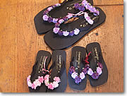 ●薔薇つきのビーチサンダルもお揃いで もう一つシナモンガールと言えば、小薔薇を飾ったビーチサンダルでも大変有名です。ビーチサンダルと言ってもお洒落度満点で、堂々とドレスに合わせたり、白い薔薇のついたサンダルを結婚式で履いたりすることもあるほど。キッズ用ももちろんあり、ハワイの女の子の大半(?)が持っているほどの、知る人ぞ知る人気アイテムなんですね。ビーチサンダルを買う際には、やはり薔薇のついたお揃いヘア・アクセサリーも買うのが、いわばお約束です。