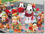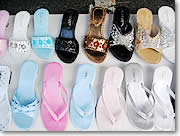 ■靴やバッグ、小物などキッズ用品がいろいろ 同様な理由で、キッズ向けの靴やバッグなどの小物、雑貨、オモチャ、ぬいぐるみなど、子供が喜びそうなアイテムも探せばたくさん見つかるのが、アロハ・スタジアムのスワップミートです。ある靴の専門ショップでは、ラインストーンのついたキッズ用サンダルが、アラモアナの某専門店のなんと半額! お土産用に、同じデザインのサンドレスを3枚、4枚とまとめ買いするアメリカ本土からの観光客の姿なども見受けられました。確かに、成長の早い子供のウエアや靴などは、お買い得なスワップミートを狙うのもいいアイデアかもしれません。 |