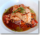 写真はマリポサのシグニチャー・メニューである、「グリルド・アップルウッド・サーモン」$22.50。軽くグリルしたサーモンはふっくらとしてボリューム感満点。シャキッとした歯応えの野菜とソフトなサーモン、やや甘めのシイタケ入りサルサソースが絶妙なハーモニーを奏でる一品。