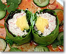 何と言ってもお勧めは、10種類以上のオリジナル・ロールをはじめ常時40種類近く揃った「スシ・ロール」(巻寿司のことですね)。新鮮な海の幸や野菜などをたっぷり巻いたスシ・ロールは、おいしくってヘルシー感バツグン。プライスも$3.95〜とお手頃です。もちろん本格派の握りや刺身も楽しめますよ。また、スシ目当てに訪れる旅行者が多いカパルア店と違い、ロコがメインのこの店では、ボリュームたっぷりのアントレ・メニューも豊富に揃っています。ビーフやラム、マヒマヒ、アヒ、サーモン、ロブスターといった素材を贅沢に使った、サンセイオリジナルのユニークなメイン料理もぜひ、お試しあれ。写真のスシ・ロールは、数々のアワードを受賞したシグネチャー・ディッシュ「マンゴ・クラブサラダ・ハンドロール」$7.95。甘いマンゴとカニ肉をマウイ産のグリーン野菜で巻いたサラダ感覚で楽しめるヘルシーなアペタイザー。あっさりとしたロールに、