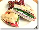 | ボリュームたっぷりのフレッシュ・ベイクド・フォカッチャ・サンドイッチ$10.95。サンドイッチの具は日替わりのお楽しみ |