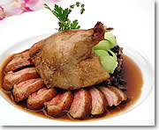 | 新鮮なミート・ディッシュも人気。ローストダックをチャイニーズ風ソースでいただくPeking Spiced Duckling。$28 |