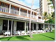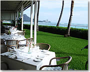 色とりどりのオーキッドに彩られた店内はとてもシンプルで上品な雰囲気。緑の芝生の先に青い海とダイヤモンドヘッドを望む最高のロケーションを満喫!