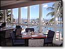 ゆったりとテーブルが置かれ落ち着いた雰囲気の店内。大きな窓の向こうにはアラワイ・ヨットハーバーと青い海が広がる