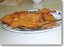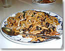 まず、ガウジー(揚げ餃子)ですが、「う〜ん、皮がパイのようにサクサクしてて美味しいっ!」。中身のお肉は少なめで、おやつ感覚でドンドンいけてしまいます。冷めてもサクサク感が残っていて、お持ち帰りにも最適。次は上海やきそば。最初「上海風餅」というものを注文してみたのですが、あいにく切れていたため、お店の方一押しのこのやきそばを頼んでみたのです。が、これが大正解! 太目の麺に濃い色のソースが絡んでいて、見た目はまるで焼きうどん。麺の食感は、讃岐うどんほどコシがなく、かといってノビノビといった感じでもなく、さっぱりしていてちょっと変わった美味しさ。何と言ったら良いのかな、ちょっと生パスタみたいな感じです。で、それに細切りのきくらげがドッサリのっていて、そのシャキシャキした歯ざわりがアクセントになって、いくらでも食べられるから不思議。お皿にてんこ盛りのやきそば、もちろんわたしたちで完食させていただきました。