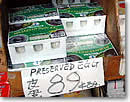 「ピータン」と言えば、ちょっと高級な中華料理店の前菜というイメージですよね。白身の部分が琥珀色で、黄身の部分が深緑! クラゲや蒸し鶏のわきに、ちんまりと並んでいる「アレですよアレ」。何だか色んなもの(深く考えまい)と一緒に瓶に漬け込んだアヒルの卵のことなのです。そんな高級前菜ピータンが、ここではなんと6個で1ドルもしないんですから驚きですよね。あちこちの中華食材店で、パック入りで売っています。私が買ったときは6個で89セントでした。「生卵よりも安いなんて…」。殻をむくと、琥珀色のツルンとした卵が出てきます。と、共に何処からともなく漂う、硫黄のようなアンモニアのような、独特の匂いが… 「く、臭い、なのに美味しい」。納豆やドリアン、ある種のチーズのように、臭いけれど美味しい物の代表選手とでも言うべきピータン、是非試してみてくださいね。ちなみに冷たく冷やして、少し置いたら硫黄臭は消えました。