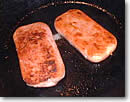パッケージの機能性はスパムの勝ちかな? さて、開いたパッケージの中には、薄いピンクのランチョン・ミートがみっちりと詰まっています。両者とも見た目にはほとんど差異はありませんね。それぞれを5ミリ厚程度に切って、フライパンでじっくり焼いてみることにしました。ランチョン・ミートからどんどん油が出てきますので、フライパンに油を引く必要はありません。