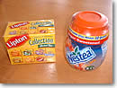 スーパーマーケットの紅茶コーナーに行くと、ありとあらゆる種類のお茶が並んでいて嬉しくなります。その中で私のお薦めは、色々な味のハーブティーが1箱に入っているもの。職場へのお土産にも良いですよね。今回は、「リプトン・ハーバルティーズ・コレクション」($3.15)をチョイス。オレンジ、ペパーミント、カモミール、ジンジャー、レモン、シナモンアップルと6種類の味のティーバッグが入っています。あと、水に溶かすだけで出来る、「ネスティー・アイスティーミックス・レモン味」($4.37)。1瓶でなんと40カップ分も出来てしまいます。いかにもアメリカって感じの甘くて香料の強いアイスティーですが、「何だか好きなんですよね〜」。
