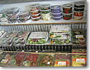 向かって左手のドアをくぐると、そこはマーケット。正面のカウンター内にはその日のお惣菜が並びます。サラダやパスタ、肉料理や魚料理など、ありとあらゆるグルメなお惣菜はすべて手作り。どれもが、すぐ食べられるよう完璧に調理されています。サラダやパスタは量り売りで、お肉や魚は一切れずつ買うことができます。私のお気に入りは、カレー味のポテトサラダ。上品なカレーの風味が、「も〜やめられません!」。