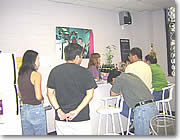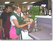 ●58種類のワインがズラリ! メニューは赤ワイン、白ワイン、デザートワインとフルーツワインの4つのコーナーに分かれています。何とその数58種類! メニューの右端にはSWEET CODE(糖度)が0から10までの数字で書かれています。一番甘いアイスワインは10、赤ワインの殆どは渋めの0です。最初は渋めの赤ワインから始め、白ワイン、フルーツワインと進んで、最後は一番甘いデザートワインでしめる、ということで、早速赤ワインからテイスティングしてみましょう。基本はグループ単位で同じワインを飲んでいくのですが、あまり好きでない場合はパスしても構いません。まずは係の人おすすめのチリ産Merlotからスタート。飲みやすいけど、最初なので控え目に評価は3、と。次はChianti、美味しくって4。親切で明るい係のお姉さんとワイワイ話し合いながらワインを決めていきます。どのワインもそれぞれ個性があって、飲めば飲むほど楽しくなってきます。 途中クラッカーやチーズをつまみつつ、試すこと約15種類。最後に飲んだ糖度10のアイスワインはまさにシロップのような甘さで、すっかりデザート代わりになりました。私のお気に入りは、赤ならオーストラリア産のShiraz、白なら花の香りがするPiesporterでした。フルーツワインではストロベリーが美味しかったし、甘〜いアイスワインも珍しくて良かったですね。ここまでがテイスティングパーティで1人$12です。これだけたくさんのワインを飲めて、ワインに関する話もたくさん聞けて、$12だなんて嬉しいですよね。 |