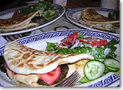 ●美味しくてお洒落なのにお値段はB級 まず、お店に入るとカウンターで注文します。カウンターの近くにメニューとお値段が書いてありますので、そこから注文し、名前を呼ばれたら取りに行きます。 私のおすすめはSouvlaki(スブラキ)、魚とラム、チキンがあります(約$8〜$10)。ちょっと酸味のあるソースでマリネされた魚、ラム、チキンがピタパンにはさんであります。それにたっぷりの野菜と、ヨーグルト、ガーリックとレモン風味のソースが付いてきます。特に美味しかったのがラム。臭みが全くなく、やわらかい口当たりで、いくらでも食べられそうな美味しさでした。 |