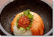 | 熱々の器でサーブされるサーモンイクラ飯$9.75は石焼ビビンバ風によ〜くかきまぜて熱いうちに召し上がれ! |