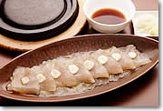 | お刺身よりやや厚めにスライスしたカジキマグロをガーリックとともに石焼にしていただくオリジナル・メニュー。$8.75 |