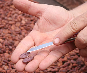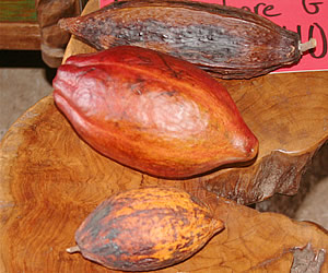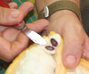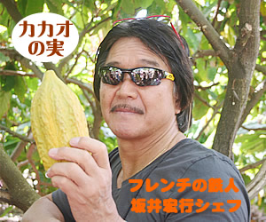 ●ハワイ原産のチョコレートってどんな味? このツアーにゲストシェフとして招待されていた料理の鉄人、坂井シェフもワイアルア原産のチョコレートを試食。鉄人は、「酸味が効いてるね」と一言。アラン・ウォンズ・レストランのオーナーであるアラン・ウォン氏もチョコレート風味のデザートを作る際には、ここのカカオ豆から作ったチョコレートを使っているのだそう。そういえば、アラン・ウォンズで食べたチョコレート・ケーキはなんとも言えない今まで味わったことのないような風味でした。その秘密は、カカオ豆にあったのですね。 |