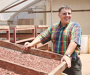 ●「ハワイでは絶対に育たない」という説を覆した 「ノースショアのこの地域一帯は12年前までは、さとうきび畑でした。さとうきび工場が閉鎖されてから、さとうきびのかわりにコーヒーやフルーツを栽培するようになったのです。でも、カカオ栽培の専門家達は、『ハワイでは絶対に栽培できない』と主張していたんですよ。赤道から遠すぎるし、カカオは日陰と湿気が必要で風に弱い中からハワイでは無理だと。他のカカオ生産地は赤道から6度から8度くらい離れた場所にあるのですが、ハワイは北緯21度。それでも、カカオを育ててみたら、成功したんですね。だから、ハワイのチョコレートは、他とは少し味が違ってダークベリーのようなフルーティーな味なのです」。なるほど、ほかではない気候条件でカカオを育てているから、ほかでは食べることのできない限定感のある味ができるという訳なのですね。 |