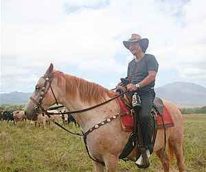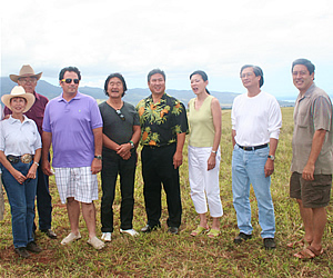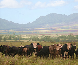 ●料理の鉄人、シェフ坂井がノースショアにやってきた! 2008年6月にオアフ島ホノルルのタマリンド・パークにて「シェフ・ドゥ・ジュール(Chef du Jour)」というイベントが行われ、日本からは料理の鉄人、坂井宏行シェフ(ラ・ロシェル)、カリフォルニア州からはジョサイア・シントリン氏などに加えて、地元ハワイの有名シェフであるアラン・ウォン氏なども登場。「イースター・シール・ハワイ」という団体のチャリティイベントとして行われたこの企画では、参加者はシェフたちの華麗な料理を堪能。この華やかなイベントの翌日に、有名シェフたちと一緒にグルメ素材の原産地を訪れる「有名シェフと行くノースショア農場ツアー」が開催され、「ハワイの歩き方」が唯一の日本語のメディアとして取材に同行しました。ワイキキから北へと約50分の位置にあるノースショアのワイアルアでハワイ産のチョコレートの原料となるカカオ豆を栽培する農場に立ち寄った後、ホルモン剤などを一切投与ぜすに育てた牛から高品質のナチュラルな牛肉を産出することで有名な「ノースショア・キャトル・カンパニー」の牧場を見学しました。