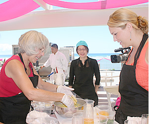 ●あなたのクラブケーキはどんな形? オアフ島きっての高級住宅地にあるリゾート、ザ・カハラ・ホテル&リゾートで開催されたグルメイベント「CUISINE of the SUN – 太陽のキュイジーヌ」の一環として行われた「シェフ・シンディのクッキング・クラス」で作る2品目の料理は、クラブ(蟹)ケーキのカレー風味。クラブケーキはお馴染みの方も多いと思いますが、カレーパウダーを使うのが、今回のミソ(蟹だけあって)ですね。マヨネーズとソースを混ぜ合わせたところへカレーパウダーを入れるのですが、ここでやさしそうなお母さんといった雰囲気の参加者が、「混ぜるのは私にまかせて」と立候補。蟹、エシャロット、パセリ、ピーマンなどが次々と入るなか、慣れた手つきで、ざっくり、ざっくりと混ぜていきます。このときの最大のポイントは蟹をつぶさないこと。さすがヘルシー志向のシェフ・シンディ、野菜をたくさん入れるのもこのディッシュの特徴のようです。よーく混ぜあわせ、塩コショウで味付けしたら、手のひらでまとめてパテにします。作る人によって形はさまざま… まるで形をとったように綺麗でこじんまりしたフレンチ風(先ほど混ぜてくれた方)、可愛く真ん丸いおわん風(日本人の方でプリティーなヤング・ママ)、厚みのあるグローブ風(カップルのご主人の方)など個性的なパテが勢ぞろい。思わず笑みがこぼれます。