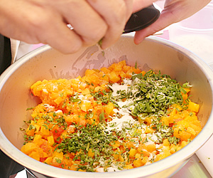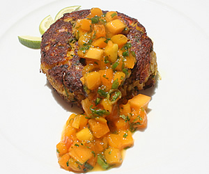 出来上がったパテは、フライパンで両面をこんがりと焼いたあと、オーブンへ。お次は、トッピングとなるマンゴとパパイヤのサルサ作り。サイコロサイズに切ったフルーツに、砂糖少量にアサツキとエシャロットを加え、最後に絞りたてのライムジュースでパンチを効かせるともう出来上がり。オーブンから取り出したパテをお皿に盛り、サルサをたっぷりとかけて、いよいよ試食タイムです。一口食べて、思ったよりシットリとした感触に新鮮な驚き… 二口目にはホクホク感とトッピングの程よい甘さがお口いっぱいに広がり、とっても美味! このクラブケーキは、蟹以外にも野菜がふんだんに入っているので、かなりの食べ応え。ご家庭の食卓には、大きめに作ってメイン・ディッシュにしてもいいかも。 |