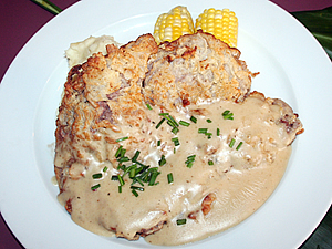 ●フライド・チキン? それともステーキ? ザ・ランチハウスのメニューはどれもこれも魅力的でなかなか決められません。ということで、シェフのクレイトンさんにおすすめ料理を作ってもらうことに。まずは、「チキン・フライド・ステーキのカントリー・グレービーがけ」。アメリカ南部の家庭料理で、チキン・フライド・ステーキという名前だけど、実はビーフ。柔らかいリブ・アイのステーキをフライドチキンのように衣を付けて揚げ、クリーミーなカントリー・グレービー・ソースを掛けたものなのです。それにしてもそのボリュームにはビックリ! 大人の手のひら2枚を合わせたくらいの大きなお肉がドーンとお皿に横たわっています。さっそく食べてみましょう。見た目とは裏腹に繊細な味で、お肉の風味がグレービーと良く合って満足感たっぷり。まろやかでやさしい味のグレービーは、さすが老舗、という味。ワンランク上の家庭の味です! |