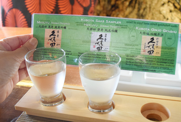 【久保田酒サンプラー $20】色んな風味が味わえて良いお酒の3点セット(下写真)。久保田利き酒セットは、まんじゅ(純米大吟醸)、へきじゅ(純米大吟醸)、げんしゅ(吟醸)の3種。久保田というお酒は新潟の朝日酒造の地酒です。五百万石という酒造好適米が原料で、甘すぎずさっぱりとスムーズな風味が魚料理にマッチします。