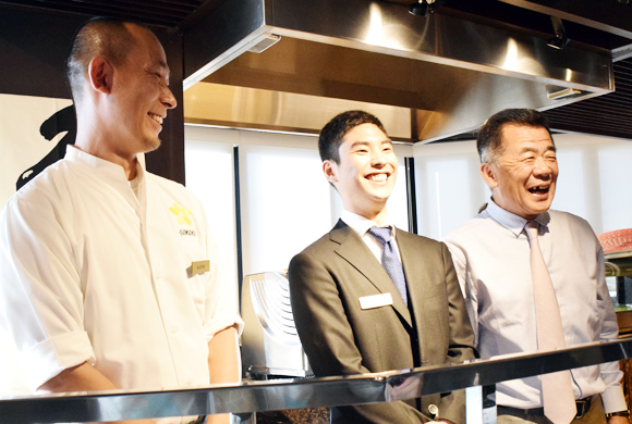 こちらはお店のスタッフ。左から総料理長の井上氏、アシスタントマネージャーのケニー・タモン氏、副社長の栗田氏。素敵なスマイルと満足のいくサービスで迎えてくれます。