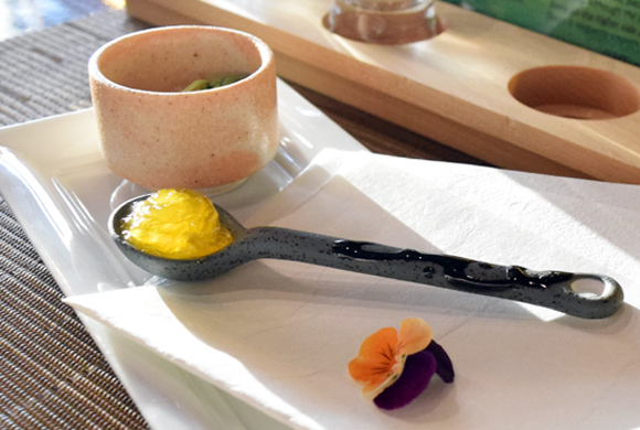 【新メニュー1:月間おつまみトリオ $5.50】お酒のおつまみ3種盛り合わせ。今回頂いたのは、酒盗と刺身和え、卵の黄身の味噌漬け、うざく豆腐の3種。自家製だといううざく豆腐は、チーズ入りの滑らかでリッチな風味が意表を突かれる美味しさ。どれも上品でお酒のおつまに味わいながらちびちびと食べたい一品。お値段が$5.50とリーズナブルなのも嬉しいですね。