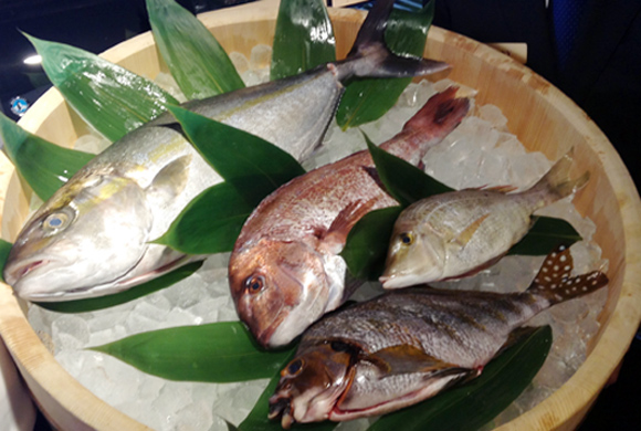 上から、九州直送のカンパチ、四国愛媛のマダイ、長崎県の笛吹きダイ、九州のタカノハダイ