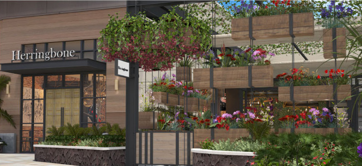 ヘリンボーンの店舗デザインは、海をテーマに、コンテンポラリーな雰囲気を取り入れつつも、ナチュラルで遊び心あふれるビーチリビングをイメージしています。ハンギングプランターで飾られたラナイの天蓋には、アイビー(蔦)が絡まり、程よい日陰を演出してくれます。また、雨天に備えて、格納式の屋根も完備。店内には、レザーのウィングバックチェアやティール(青緑色)のメタルとクッションの椅子がならび、木材をふんだんに使用した寛げる雰囲気が人気です。