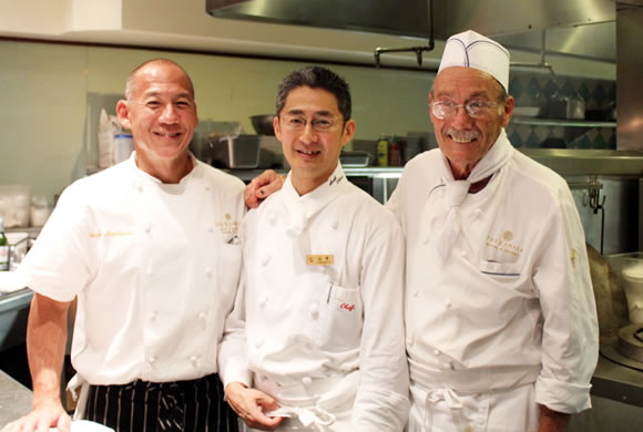 ザ・カハラがオープンしたのは1964年のこと。当時はカハラ・ヒルトンという名前でした。そのカハラ・ヒルトンを代表するレストランとして隆盛を極めたのが、マーティン・ワイス・シェフが率いる「マイレ・レストラン」(写真上)でした。 今回のディナー・イベント「リメンバー・マイレ・ディナー」とは、「マイレ・レストランの味を思い出すディナー」ということ。ザ・カハラのウェイン・ヒラバヤシ総料理長(下写真、左)にマーティン・ワイス元総料理長(右)、そしてカハラと提携するホテルオークラ東京内のフレンチ・レストラン「ラ・ベル・エポック」の山本克哉料理長(中)、と3人のトップシェフが競演し、ザ・カハラの粋を集めた一生に一度の素晴らしいディナーを提供してくれる、夢のようなイベントなのです。