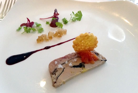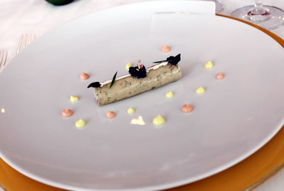 このディナーにはワイン・ペアリングが付いてきます。お料理に合うワインを楽しみながら、ゆっくりと最高のディナーを味わう人々の華やかなさざめき、グラスを合わせる澄んだ音に包まれ、気分はどんどん盛り上がります。レストランの人々のサービスも素晴らしく、お料理が出てくるたびに丁寧に説明してくれるのも嬉しかったです。 2品目はワイス・シェフが伝統的な手法で作るフォアグラのテリーヌです。マイレ・レストラン時代のカハラの伝統を感じさせながらも、すっきりとライトでモダンに仕上げてあり、濃厚なフォアグラをとても美味しくいただくことができました。また水彩画のように美しい盛り付けも見事で、さっと筆ではいたような赤ワインのソースや琥珀色の小さな賽の目型のジェリーがまるで宝石のような輝きを見せていました。