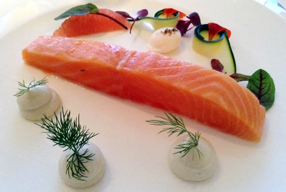 次に登場したのは、山本シェフによるマリネしたサーモンのコンフィです。一見サーモンのお刺身のように見えますが、一口食べてみてビックリ! まるでクリームのように柔らかく、文字通り口の中でとろけるようです。生臭みはまったくなく、ひたすら上品なサーモンの美味しさが口に広がります。白ワインとともに味わうと、まったりとした風味が増幅され、思わずうっとりと目を閉じてその美味しさを舌と心に刻みつけました。山本シェフにお話をうかがうと、サーモンは低温のオリーブオイルでゆっくり、じわじわと時間をたっぷりかけて調理したものだとか。