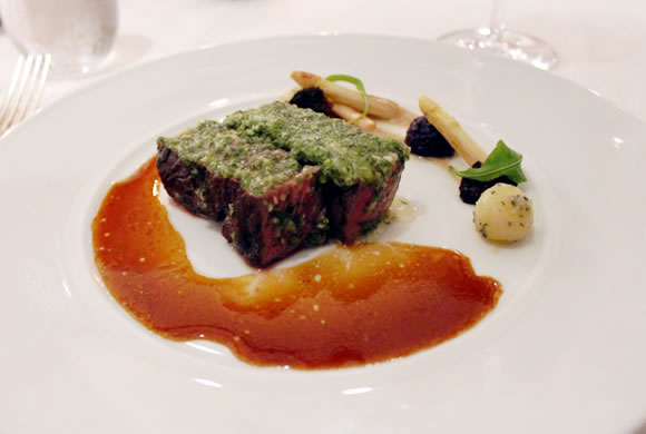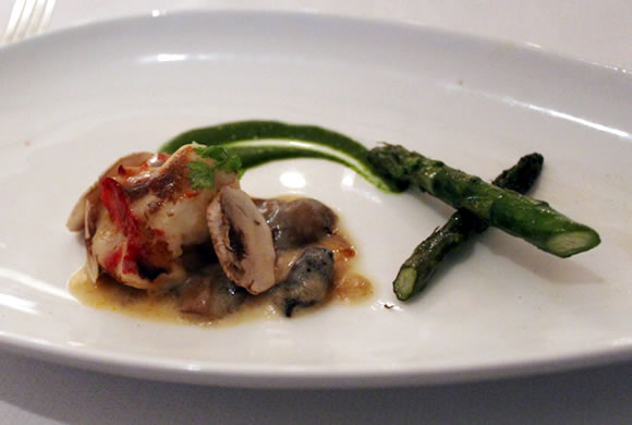 ディナーはまだまだ続きます。続いては、ワイスシェフによるロブスターのテルミドールが登場しました。肉厚のロブスターとマッシュルーム、ソース、しゃきっとした部分を残したアスパラがえもいわれぬ素敵なバランスを作り上げています。プリッとしつつもふんわりと弾力のあるロブスターの歯ざわりが抜群で、思わず笑顔になってしまいます。 たくさんの種類のお料理が登場しますが、どれも上品な盛り付けで程よい量なので、お腹一杯になりすぎずちょうど良い按配です。新しい一皿が出てくるたびに、違った趣向が楽しめるし、ワインとのマッチングもそれぞれ違ったハーモニーを奏でるので、最初から最後までワクワクとした気分が続き、食の好奇心をしっかりと満たしてくれました。
