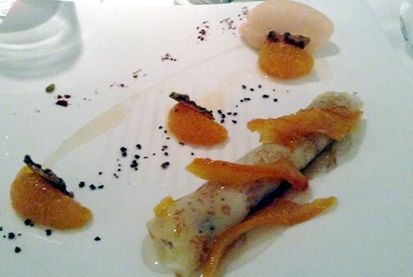 最後に登場したのは、素敵なデザート「クレープ・シュゼット」です。オレンジの香りが爽やかなクレープは、ワイス氏の手によるもの。カハラの伝統に裏打ちされた上品で大人っぽいデザートでした。リキュールが仄かに香り、添えられたシャーベットは口の中をさっぱりとリフレッシュしてくれました。食後のコーヒーと共に、一口サイズのプチフールも出され、徹頭徹尾、エレガントでセレブな気分が味わえる素晴らしいディナーでした。