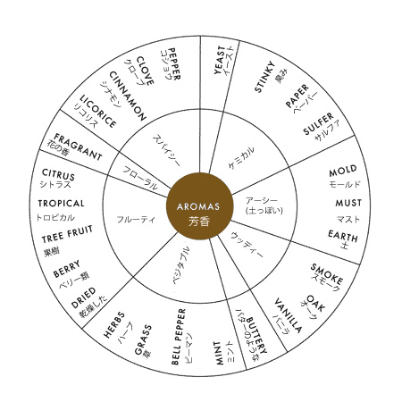 ワインの香りをかぐことと味わうことは僕たちの体のほとんど同じ部分でおこなわれるんだ。嗅覚中枢とよばれるこの部分は、ワイン・テイスティングでももっとも大事な部分なんだよ。でも、ワインのフレーバーというのは、香りと味の世界のなかでは、本当に小さな一角をなしているに過ぎないんだけどね。時にワインの味と香りはあまりにもほのかで、説明しがたいときもあるね。 なら、ワインの味を説明するのにはどうしたらいいんだろう…それは、練習、練習、練習あるのみ! 右のワインテイスティング・ウィール(ワインの味早見表)を使って、ワインの味を説明する言葉を勉強してみてね。ワインの香りをかぐときは、鼻をグラスに突っ込んで、深く香りを吸い込むんだ。なんども繰り返して、早見表のなかでしっくりする表現を探してみてね。 間違いは恐れなくていいよ。友達と一緒に、レストランで、イベントで、どんどんテイスティングしてみよう。お店の人やエキスパートに聞くのもいいね。友達にも聞いてみてね。だって、それぞれの人は、違った香りを発見するものだからね。 |