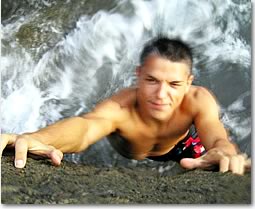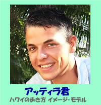 彩子: 先月は、「ハワイの歩き方」の連載「B級ライフ」の番外編に「イメージ・モデル」としてご出演いただき、ありがとうございました。「一体、アッティラ君って誰なの?」という声が殺到しまして(笑)、読者の皆さんへのご紹介として「幸せのオーラ」インタビューをさせていただきますね。