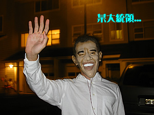 いろんなコスチュームを物色した末、「この中で一番怖いのはこれだね!」とスカイが選んだのは、なんとオバマ大統領のマスク。「ちょっと被ってみてごらん」と息子に被らせると、ほんとうにリアルで怖い。もう、オバマ大統領で即決! ハンターは、去年スカイが使ったドレッドヘアーの骸骨のマスクをお譲りでリサイクルすることで決定しました。 ハロウィーン当日、ちょっとあたりが薄暗くなってくると、最初「ハロウィーンなんて…」と言い切っていたハンター君が、「ママ〜、早く行かないとキャンディーなくなっちゃうかも」とかなり心配顔に。やっぱりいくつになってもキャンデー欲しいんだね(笑)。 後半につづく… (2009年11月更新) |